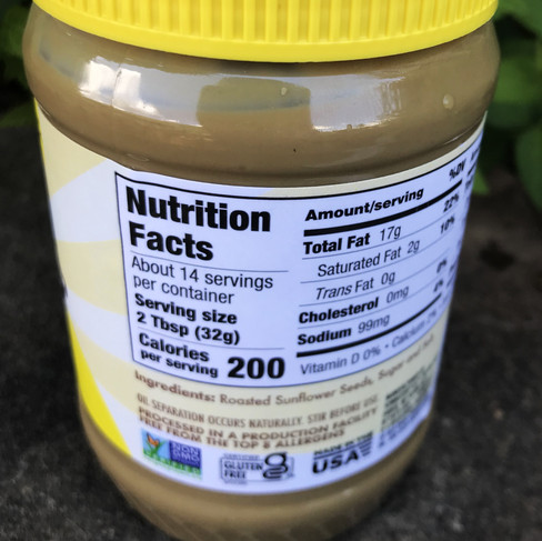 When reading a label, the first thing to look at is the serving size. How much food is considered a portion? Next look at the ingredients list. What is actually in our food? The first ingredient is always the majority of what is in the container. The ingredients found later on the label's ingredients list are found in increasingly smaller amounts the further down the list you go. Mott’s Applesauce has apples, water, and ascorbic acid (vitamin C). Sunflower butter contains roasted sunflower seeds, sugar, and salt.